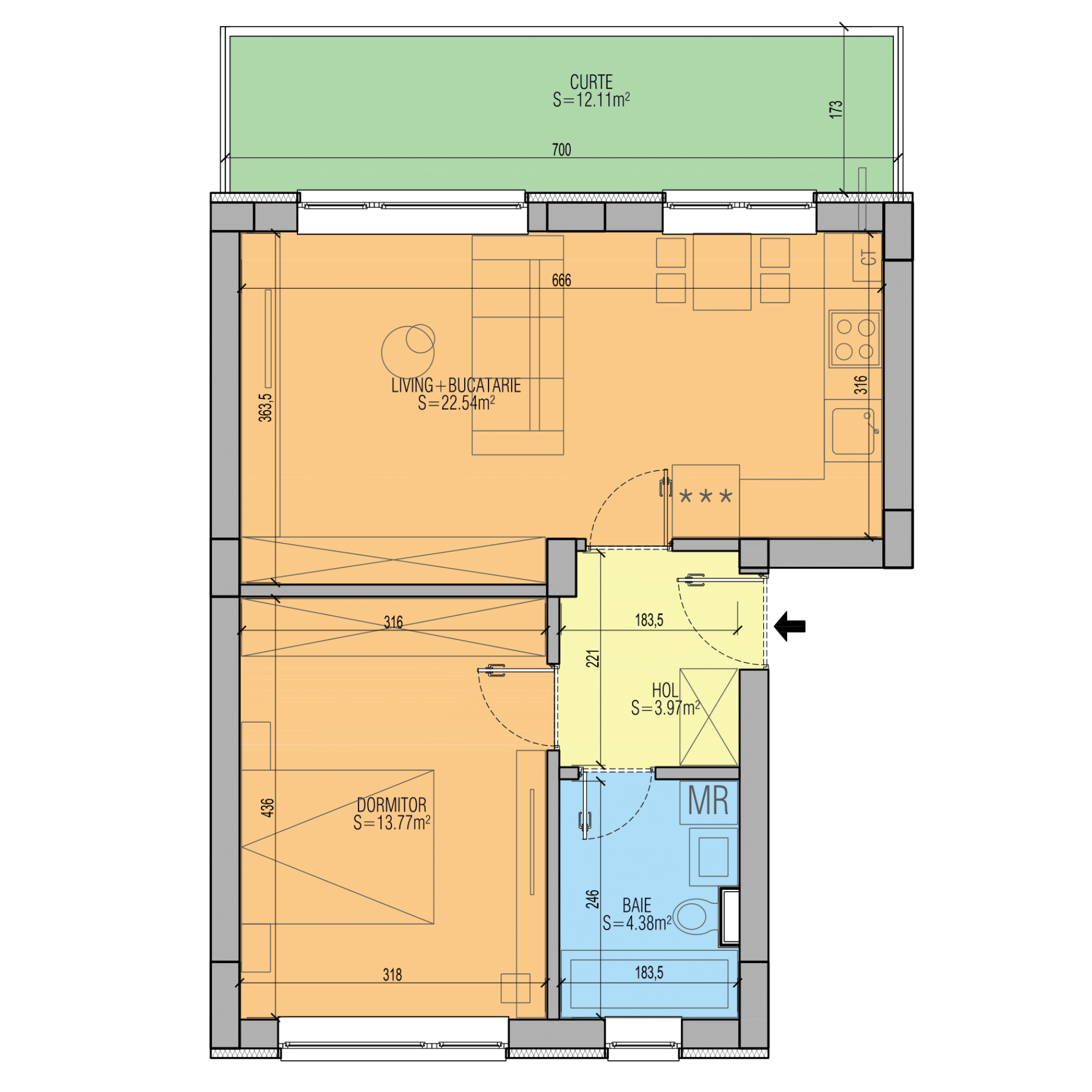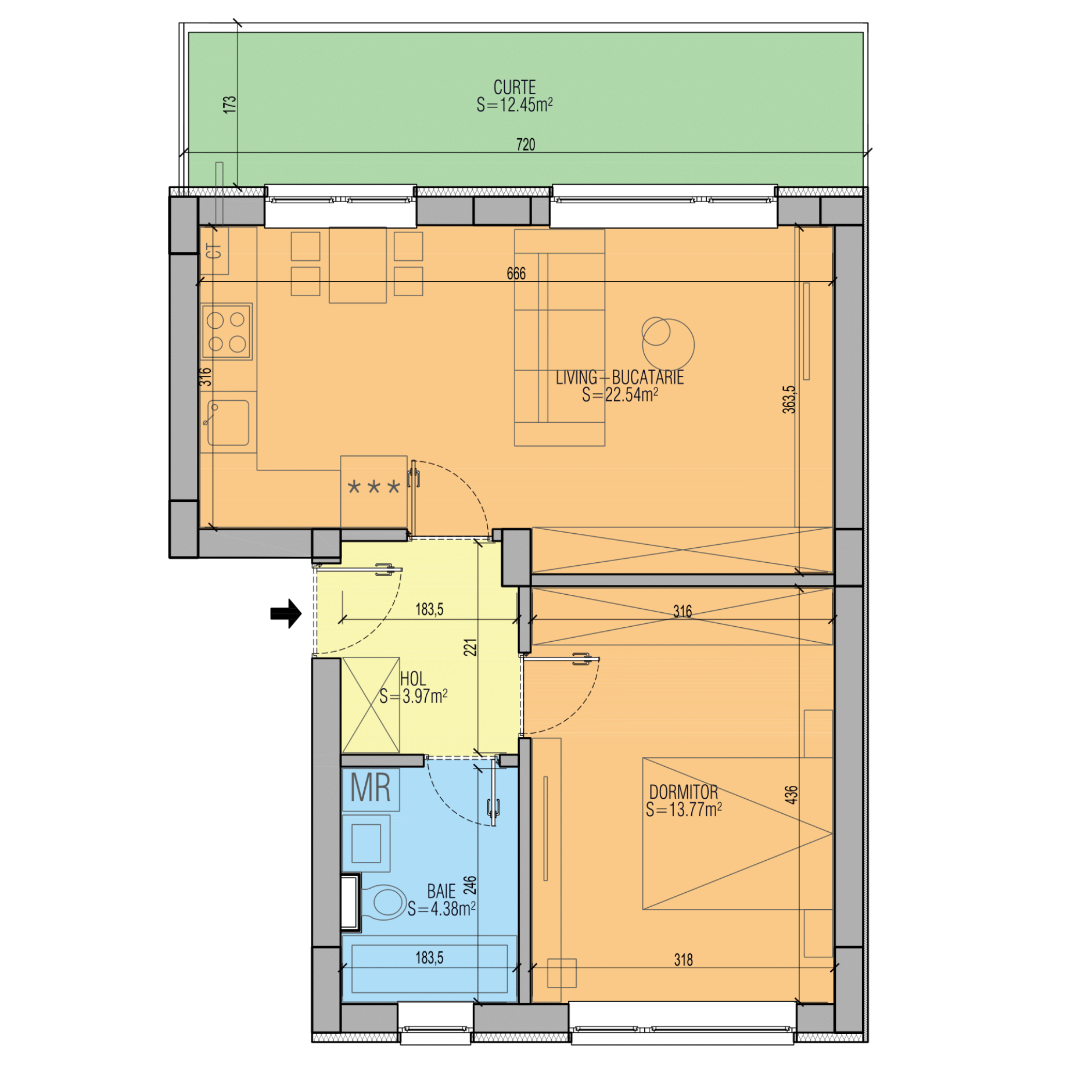 Apartament de 2 camere la parter de Tip 2 la Scara D, suprafață totală: 56.77mp