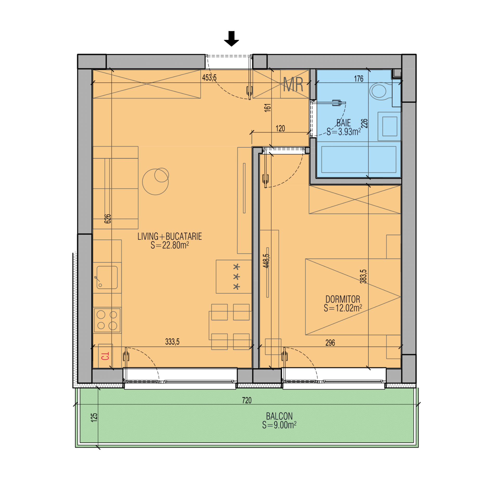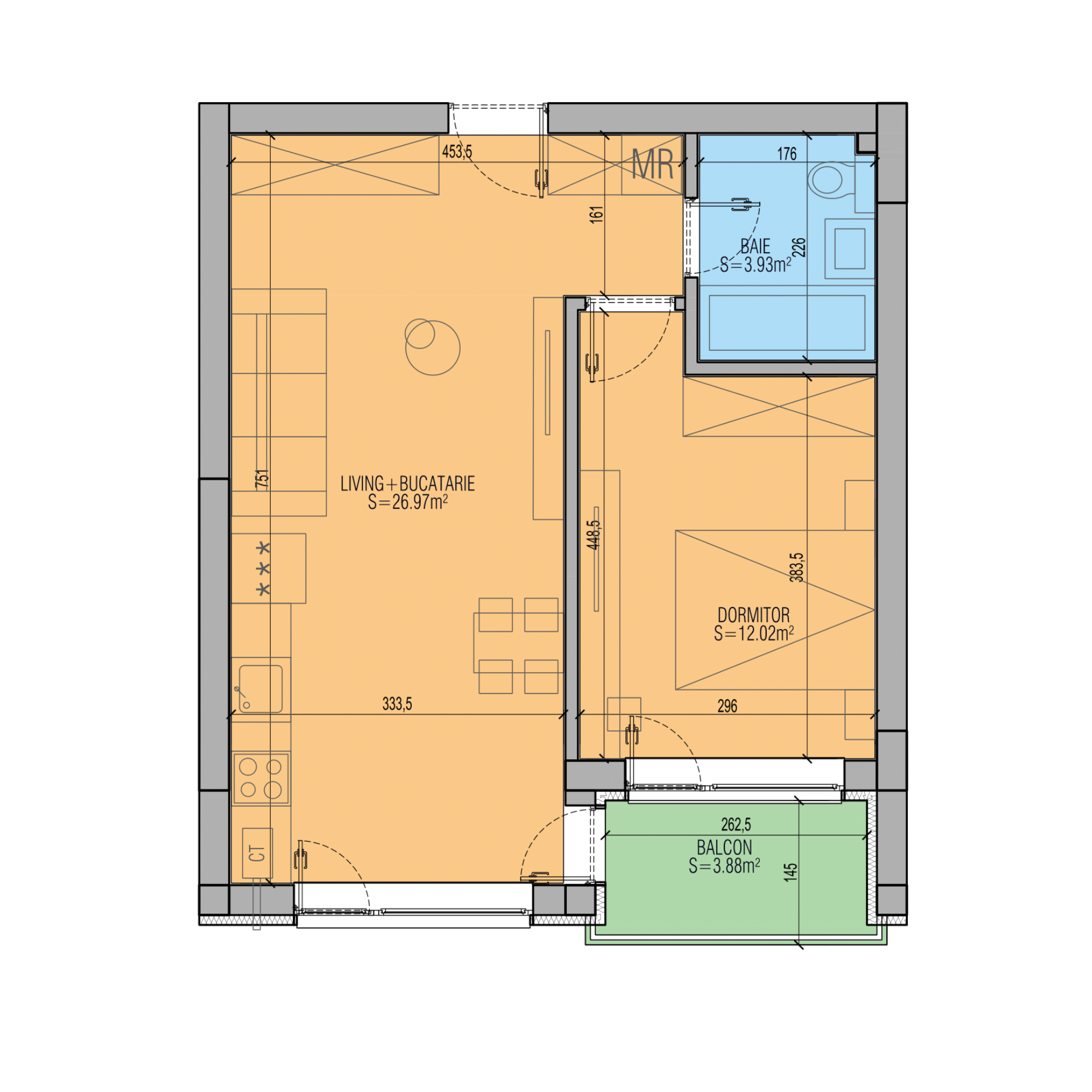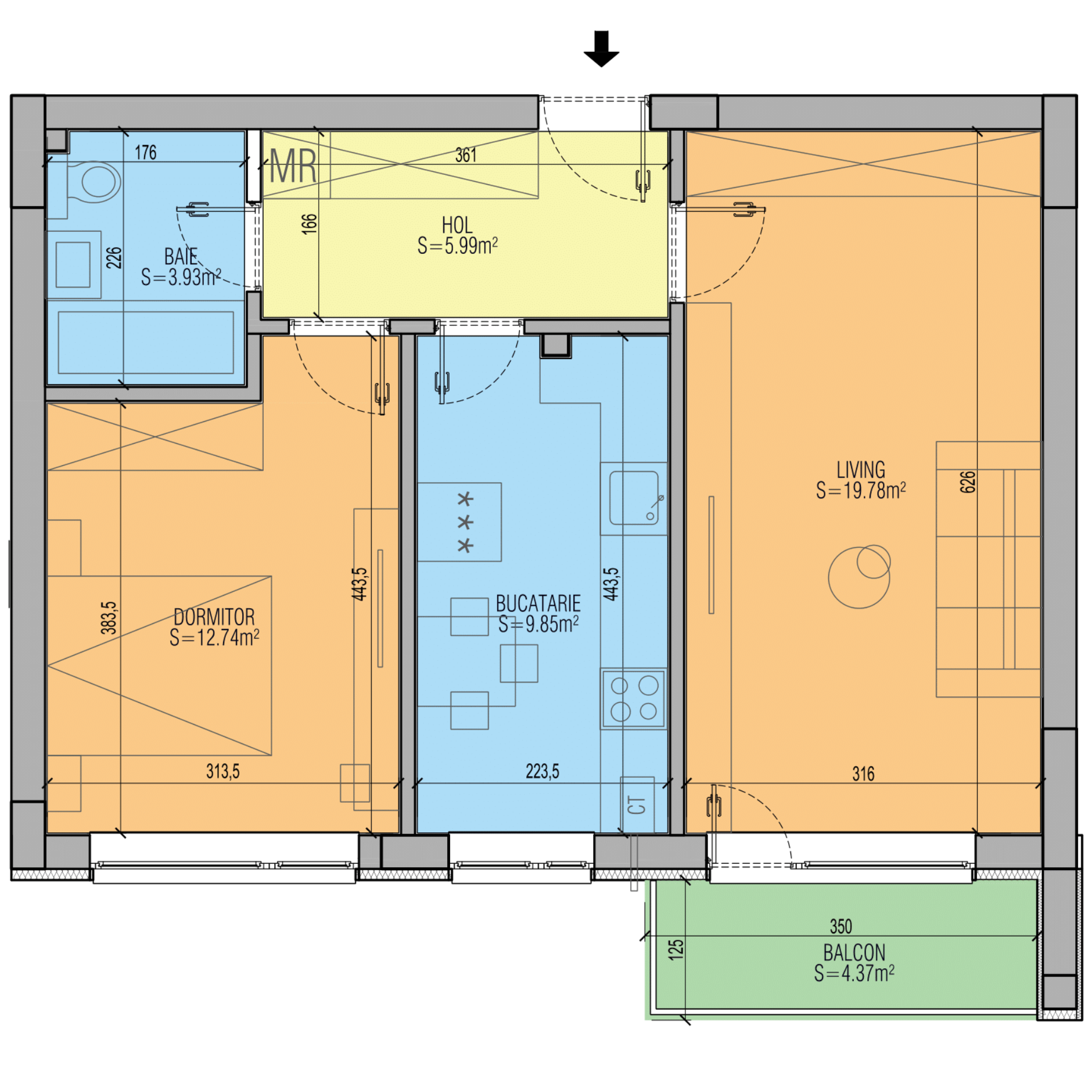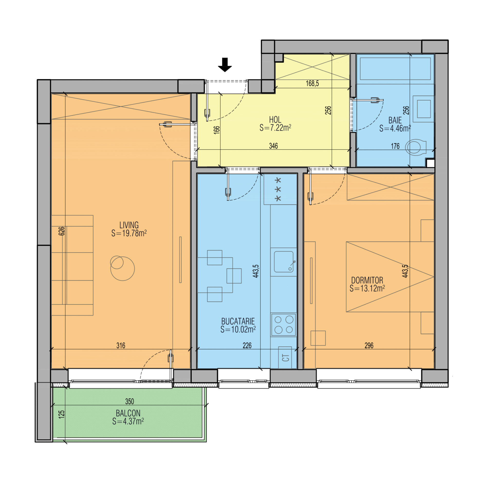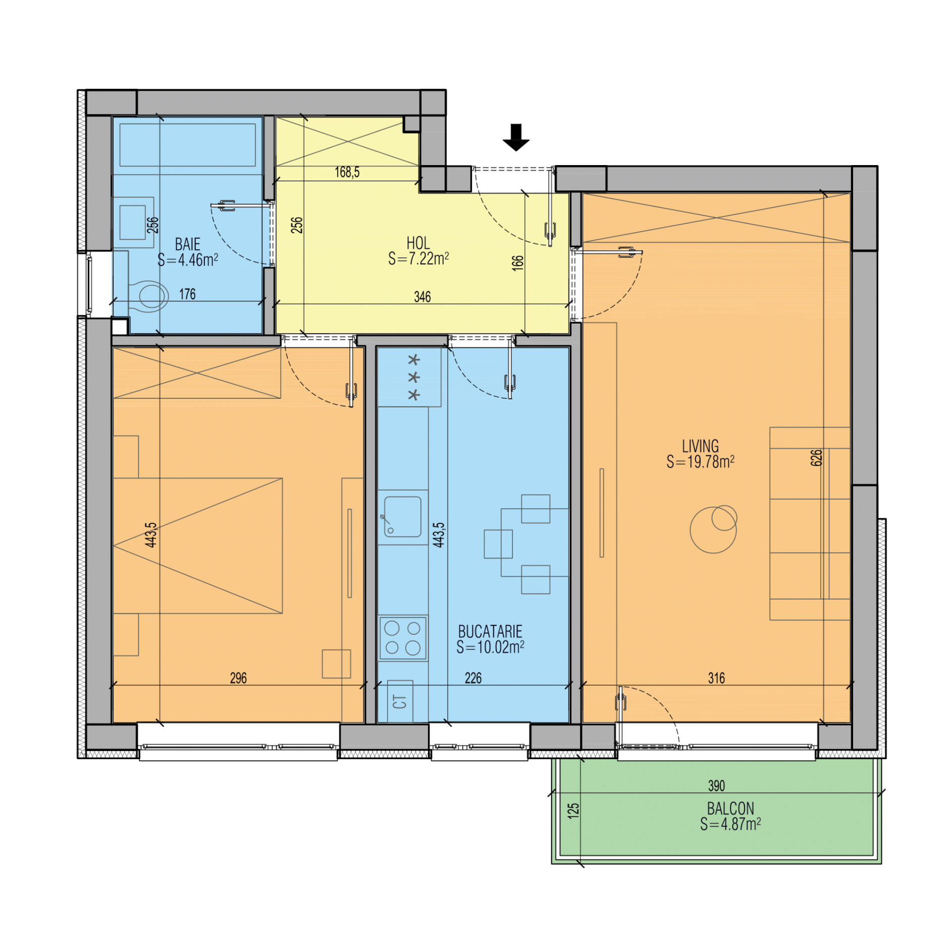 Apartament studio la etajul 1, 2, 3 de Tip 38 la Scara H, suprafață totală: 46.80mp