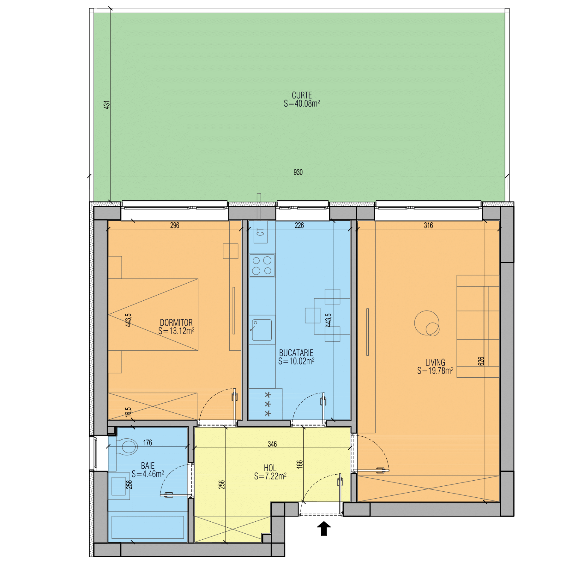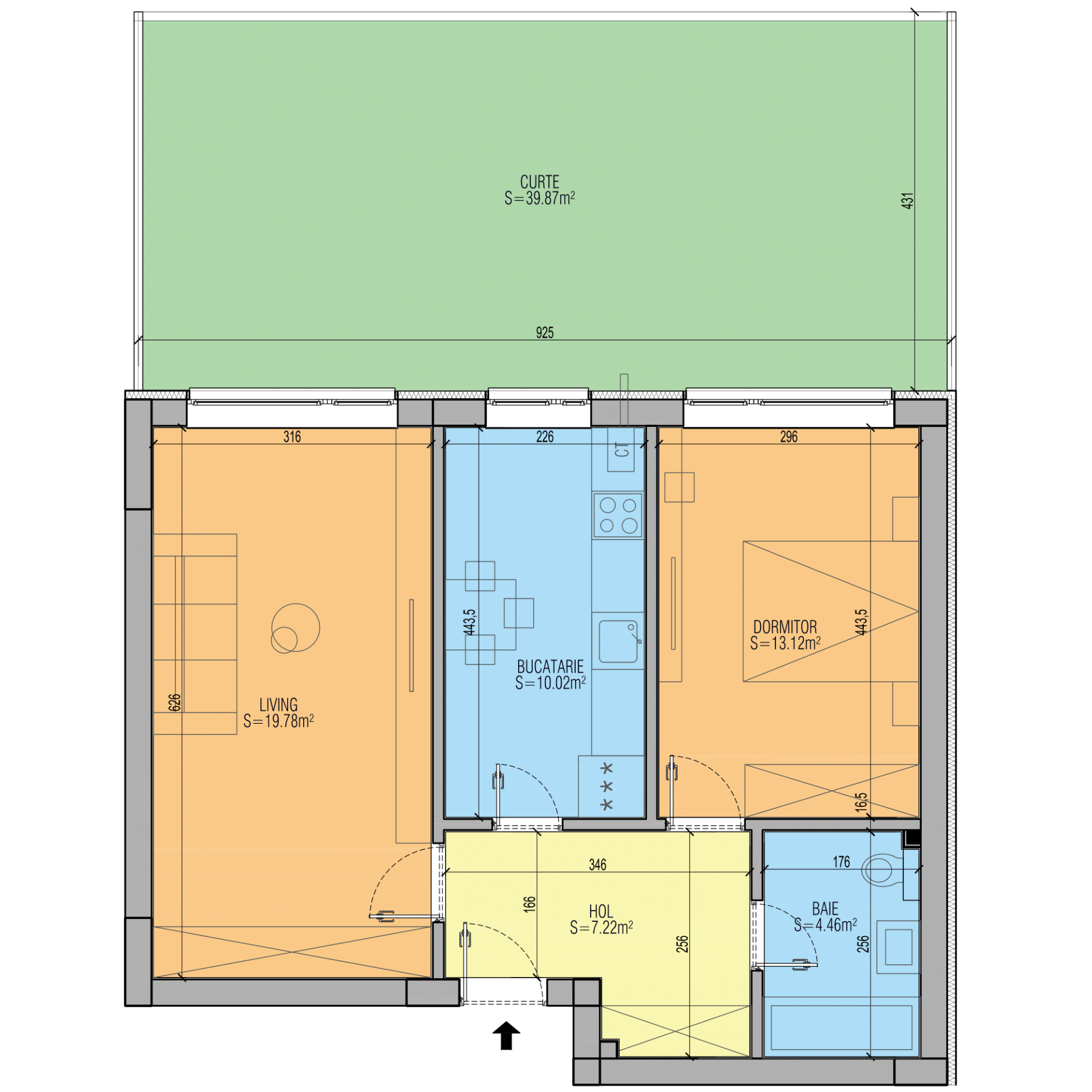 Apartament de 2 camere la parter de Tip 35 la Scara H, suprafață totală: 94.68mp