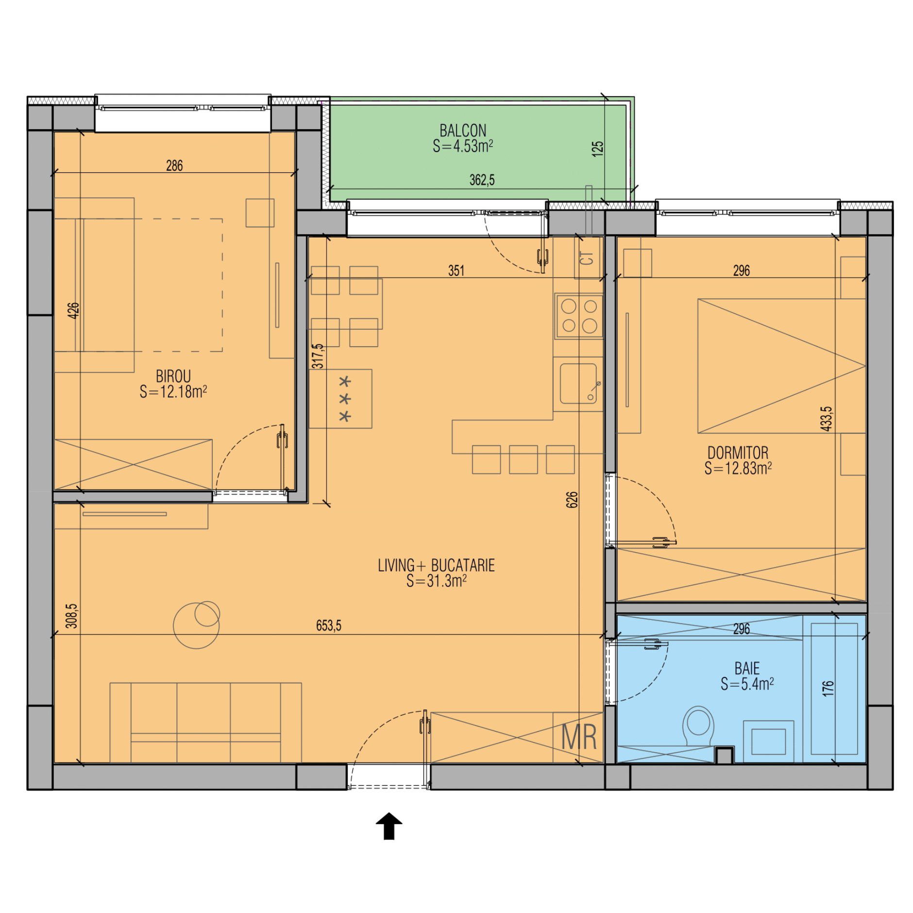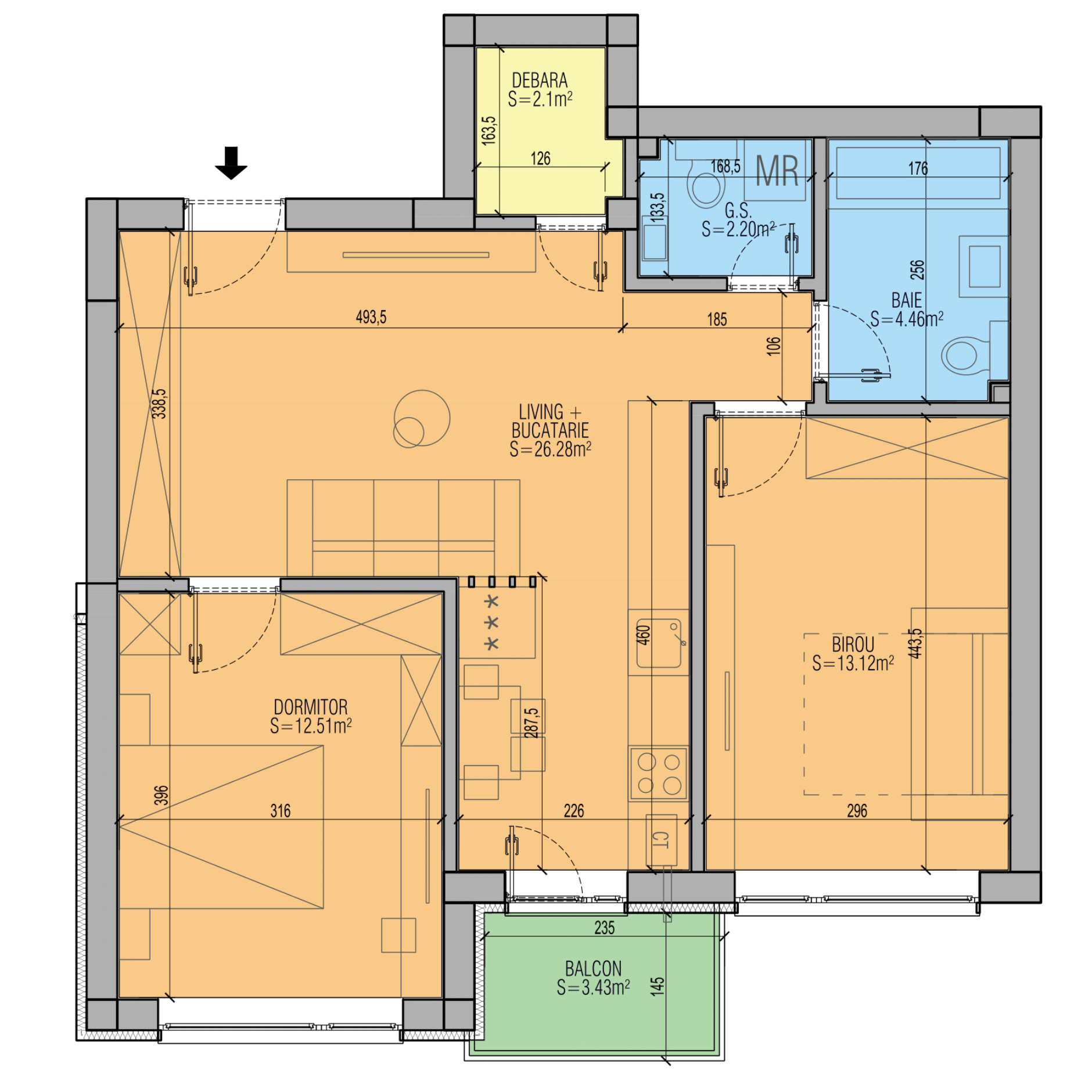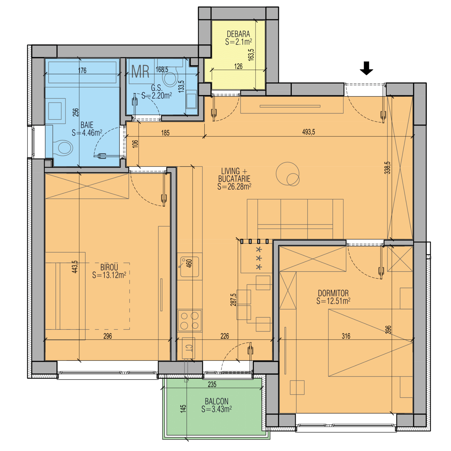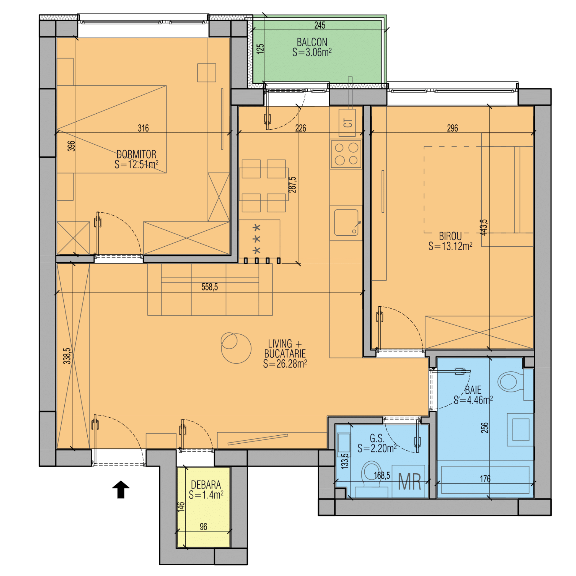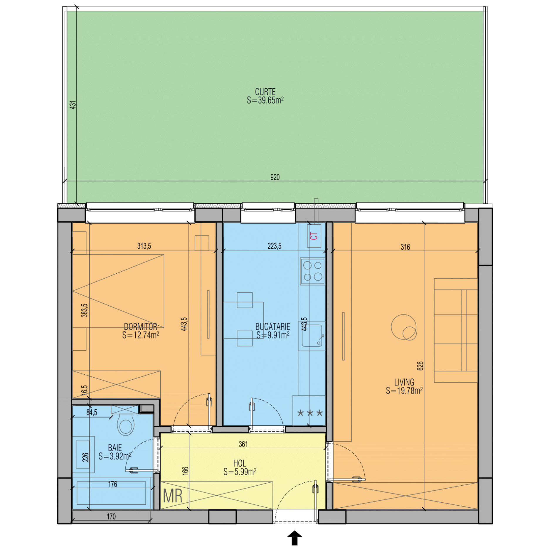 Apartament de 2 camere la parter de Tip 30 la Scara H, suprafață totală: 56.66mp