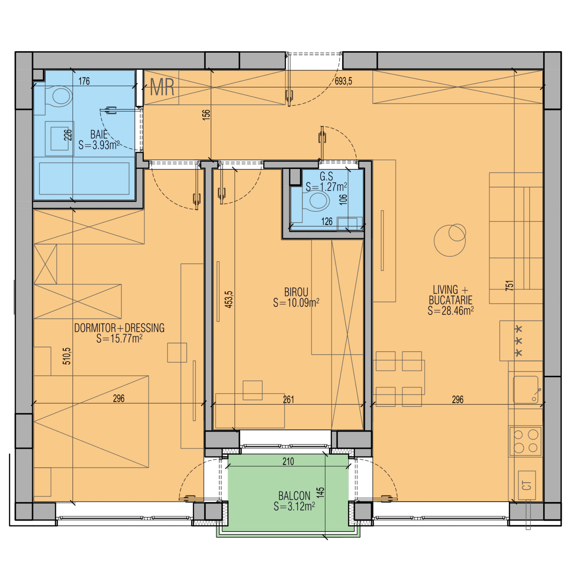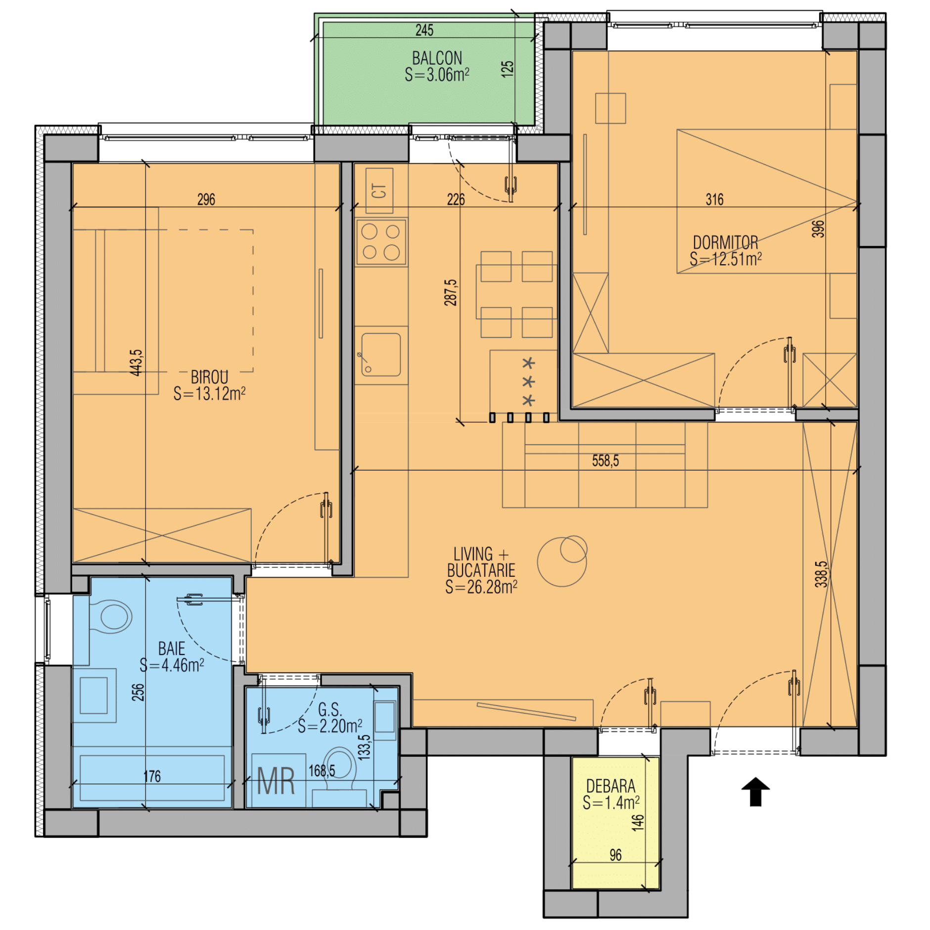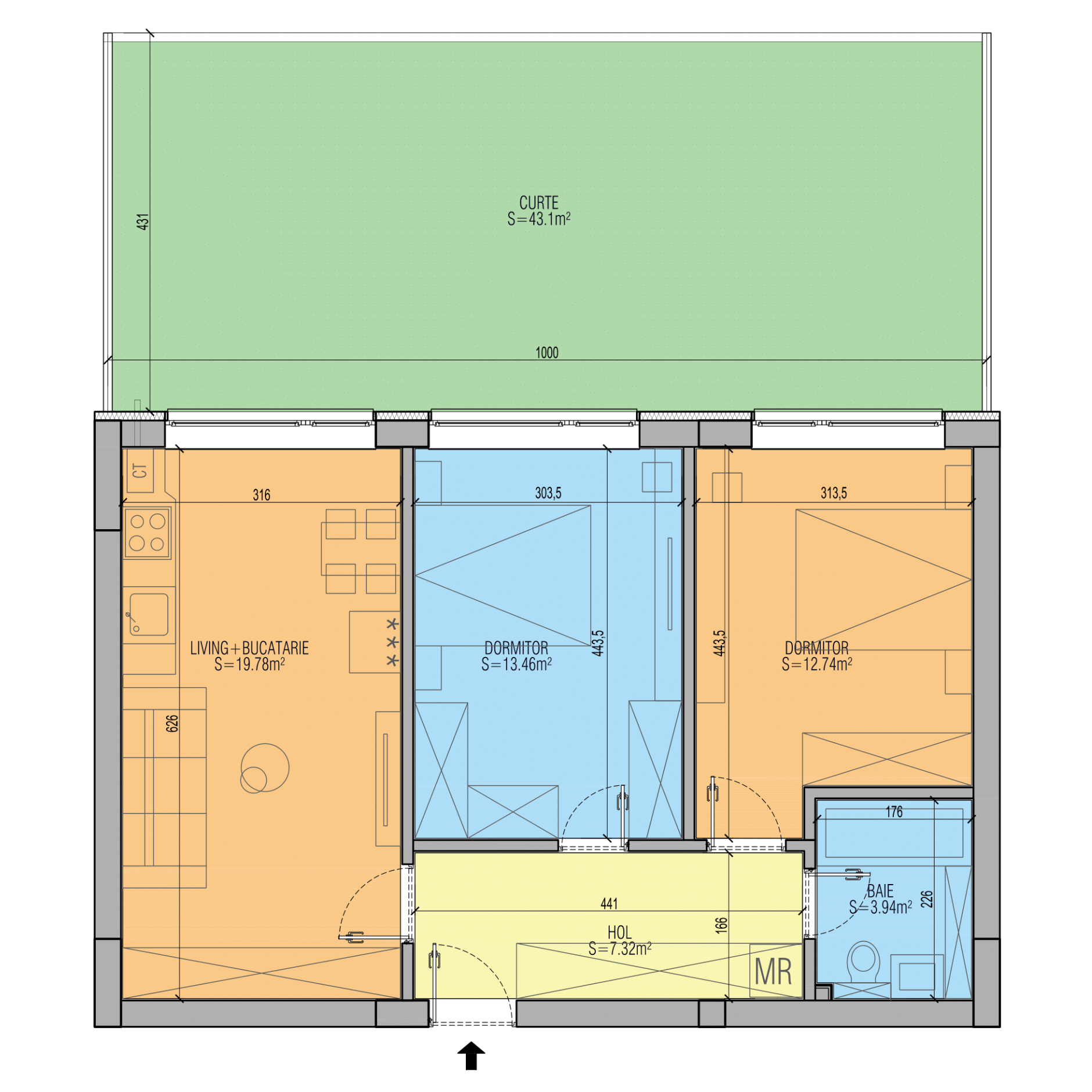 Apartament de 2 camere la parter de Tip 32 la Scara H, suprafață totală: 94.47mp