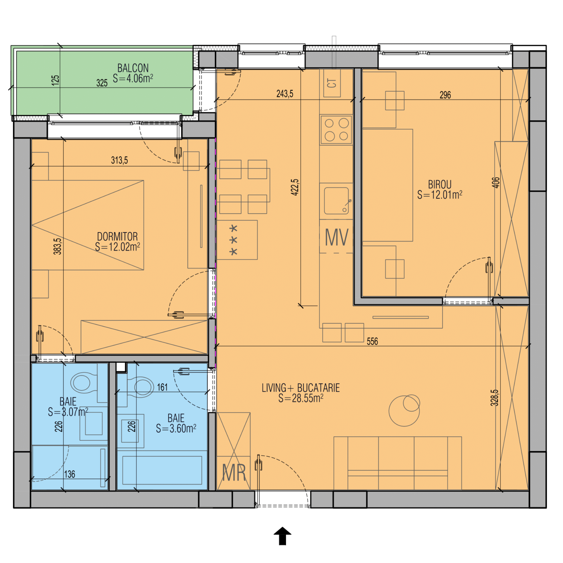 Apartament de 3 camere la etajul 1, 2, 3 de Tip 42 la Scara H, suprafață totală: 66.03mp